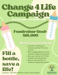 Our Change 4 Life Campaign is a simple but powerful way for our community to support the life-affirming work of Greene Pregnancy Center throughout the year. By filling baby bottles with spare change, cash, or checks, individuals, families, churches, and businesses partner with us to provide hope, resources, and compassionate care to women and men facing pregnancy decisions.